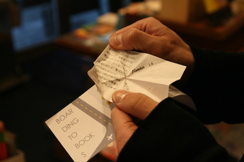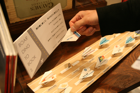 旅から帰る場合は、本を棚に戻し、飛行機としおりをスタッフにお返しください。